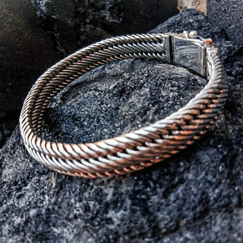 Sterling silver snakeskin style triple waving bracelet with box clasp closure.