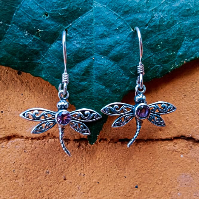 Sterling earrings in dragonfly shape with genuine semi-precious stones