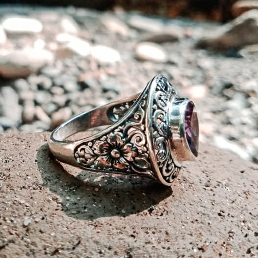 Sterling silver round ring, simple Bali ornate design with semi-precious gemstone