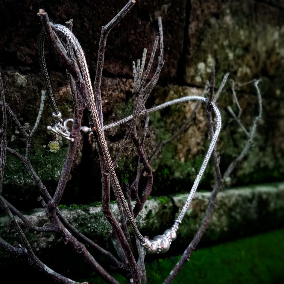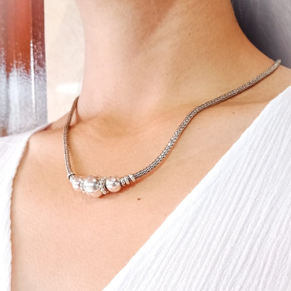 Sterling silver 2.5 mm snake chain necklace with 3 silver balls hanging on the bottom. This classic design of a chain necklace is very suitable for any special occasion.