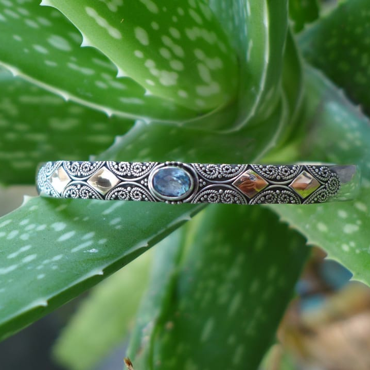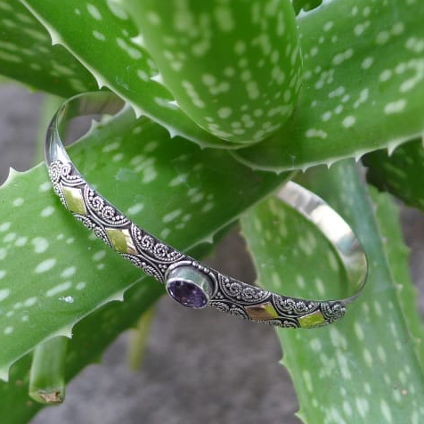Sterling silver cuff bracelet with gold accent in traditional wire pattern and silver dot design, with semiprecious stones in the middle.