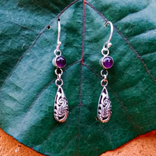 Sterling silver earrings with gemstone and simple drop shape pendant ornate design