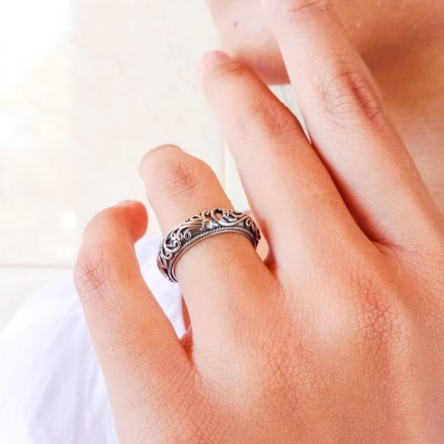 Sterling silver handmade Bali bun or ornate design ring band. This classic design of the ring is very suitable for any occasion.