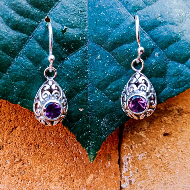 Sterling silver earrings fat drop shape, ornate design with gemstone.