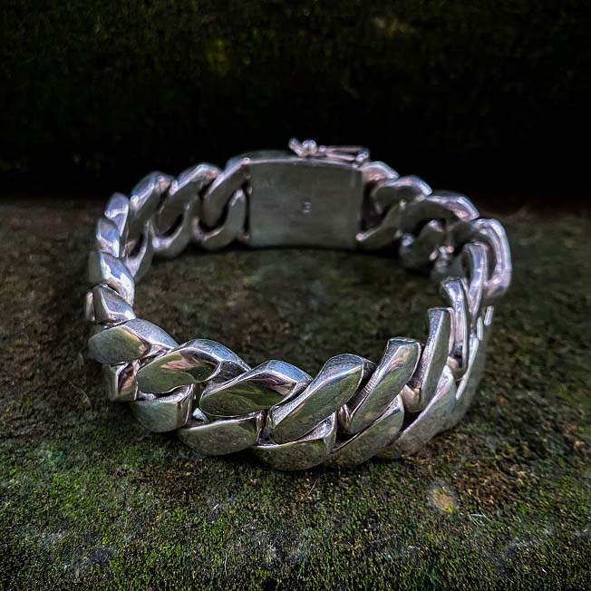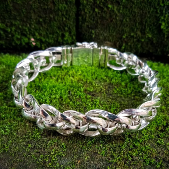 ![]() | KH-CHB009 | Sterling silver chain, Cuban link bracelet. | 13 mm width, 4 mm thick, Length: 6.5″-9″, Est. Weight: 55-77 grams | $ 1.25-$1.50/ Gram |