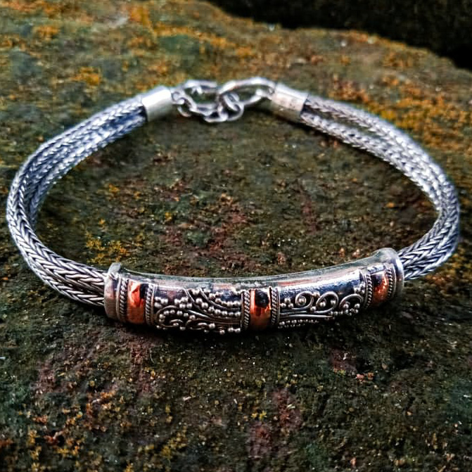 ![]() | NY-CHB020 | Sterling silver snake chain bracelet. With a beautiful design and gold accent. | 3 mm diameter, double. Length:6.5″-9″ Est.Weight:12-18 grams | $29.00/ Piece |