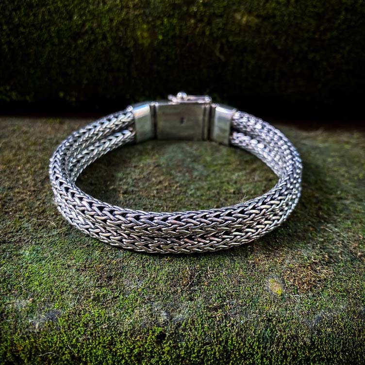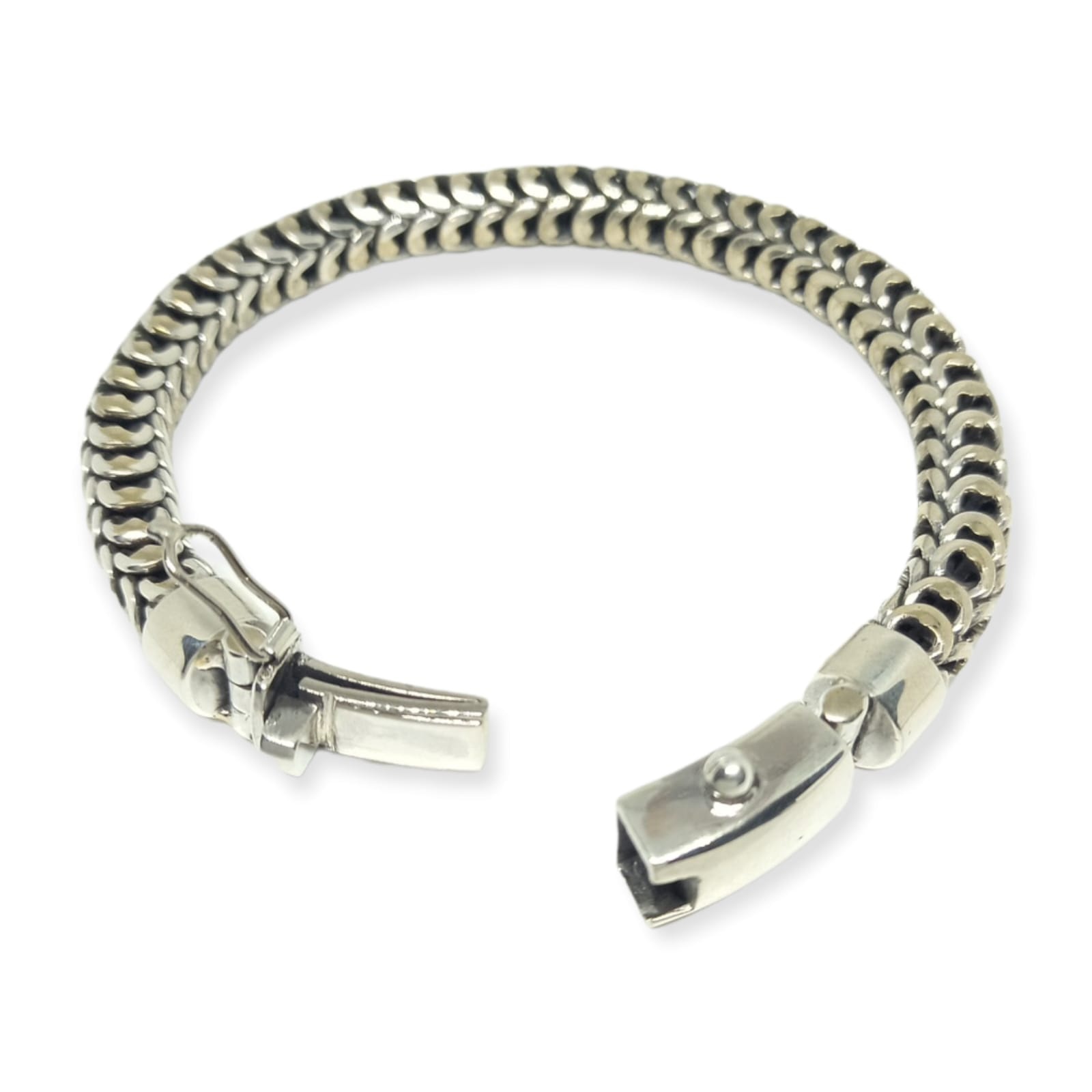![]() | NY-CHB046 | Sterling silver double snake chain bracelet with a box clasp. This fancy and classic | 6 mm thick x 12 mm width, Length: 6.5″-9″, Est. Weight: 58-79 grams | $1.25 to $ 1.50/ Gram |