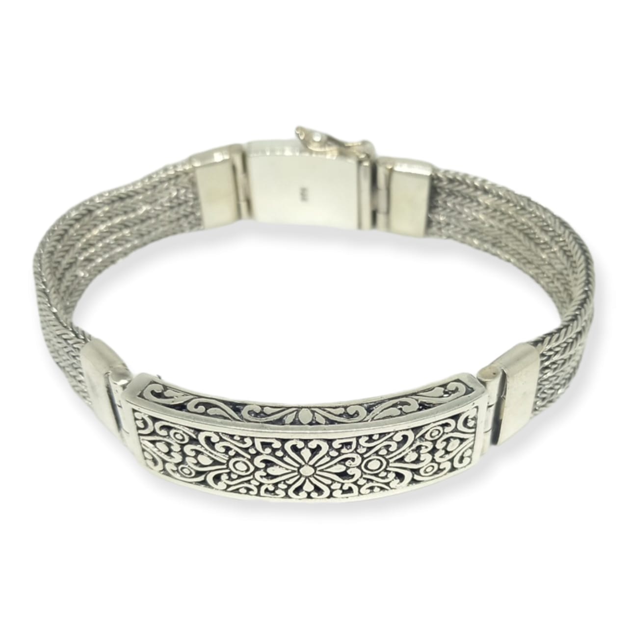 ![]() | NY-CHB063 | Sterling silver V chain bracelet. With multi-bezel setting stones, Bali ornate design in the middle. | Stones Size: 8 mm, 7×9 mm 6 mm width Length: 6.5″ – 9″ Est. Weight: 30 – 40 grams | $49.00/ Piece |