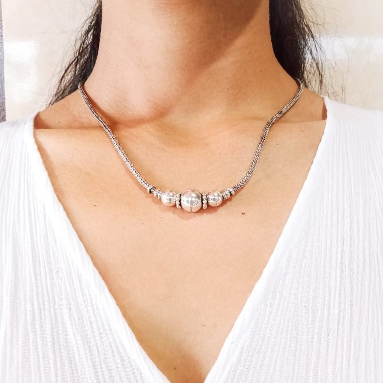 ![]() | NY-CHN003 | Sterling silver snake chain necklace with 3 silver beads. | 2.5 mm thick , Length: 19 “, Est. Weight: 24 grams | $1.25-$1.50/ Gram |