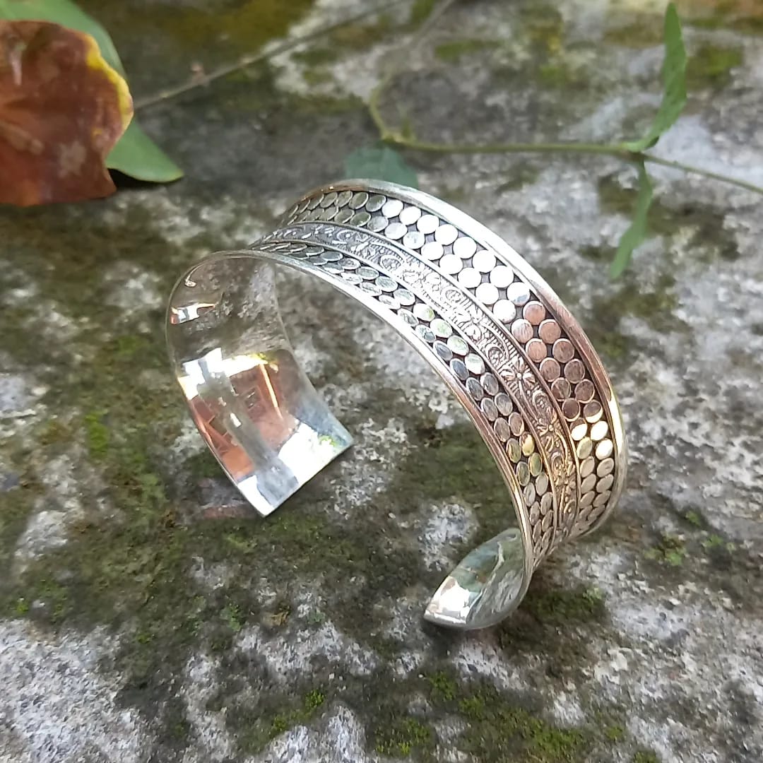 NY-CFB006Sterling silver cuff bracelet with gold accent.Diameter: 60 mm, Width: 6 mm, Est Weight: 10 grams.$28.99/ Piece