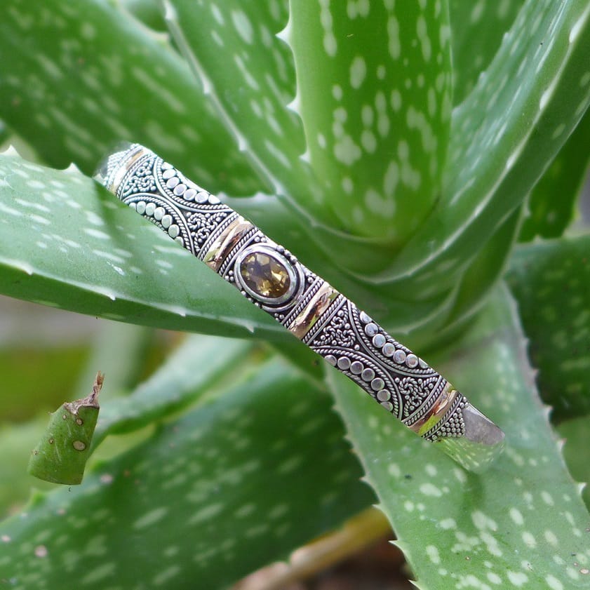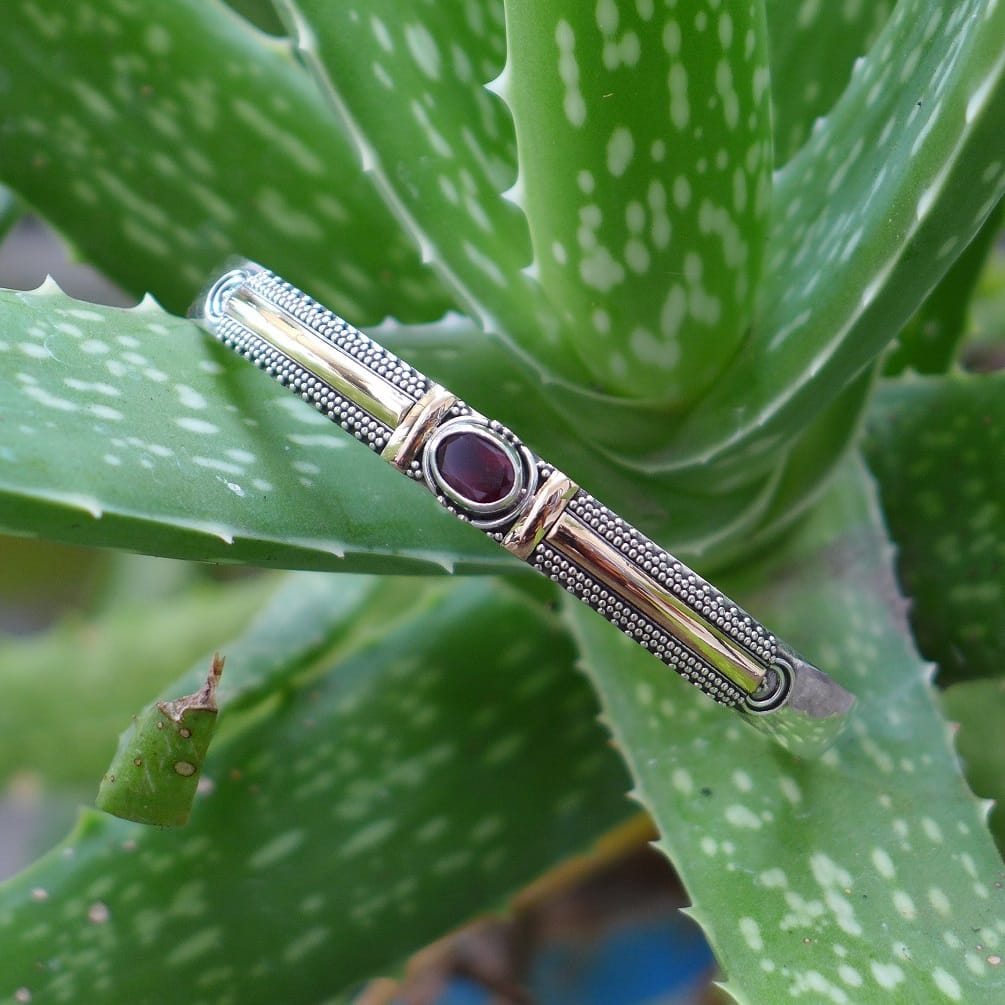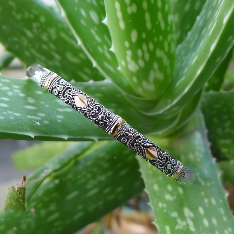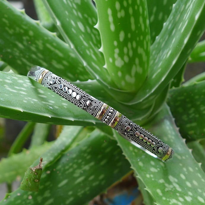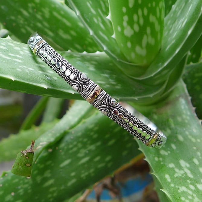 NY-CFB013Sterling silver cuff bracelet with gold accent.Diameter: 58 mm, Width: 6 mm, Stones: 6×8, Est Weight: 11 grams.$28.99/ Piece