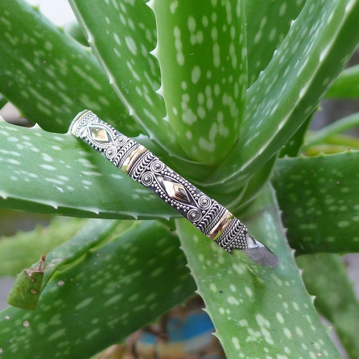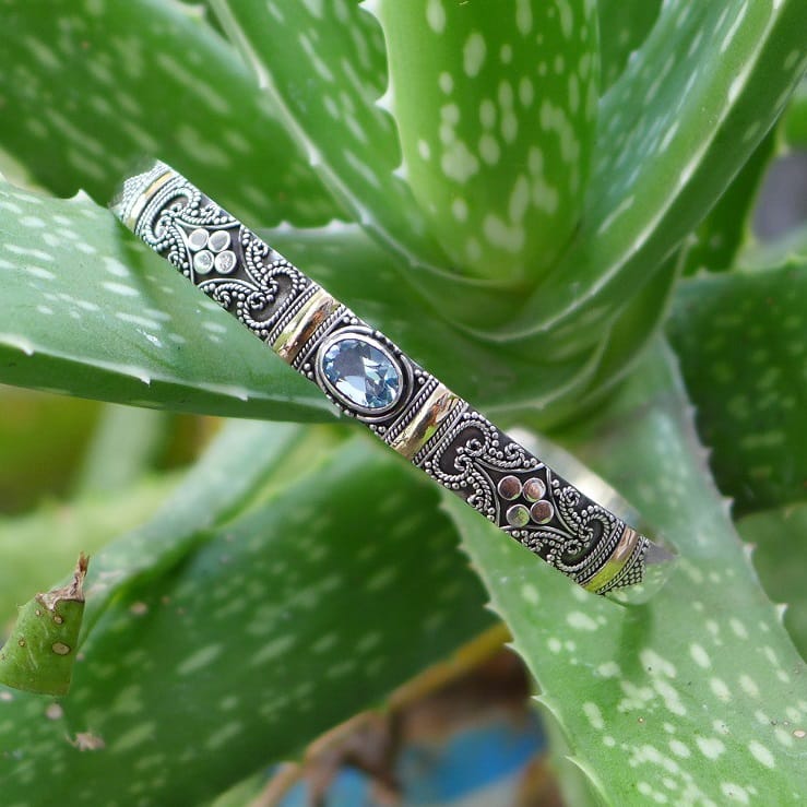 NY-CFB016Sterling silver cuff bracelet with gold accent.Diameter: 58 mm, Width: 6 mm, Stones: 6×8, Est Weight: 11 grams.$28.99/ Piece