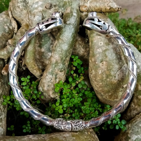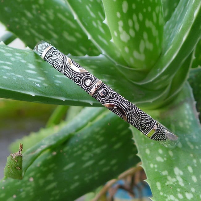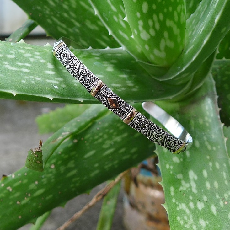 NY-CFB030Thin and lightweight sterling silver cuff bracelet, with ornate design ornament.Diameter: 60 mm, Width: 10 mm, Est Weight: 8.5 grams.$23.99/ Piece