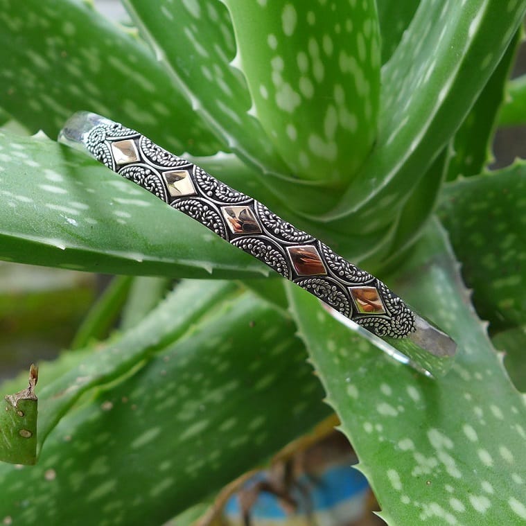 NY-CFB014Sterling silver cuff bracelet with gold accent.Diameter: 58 mm, Width: 6 mm, Stones: 6×8, Est Weight: 11 grams.$28.99/ Piece
