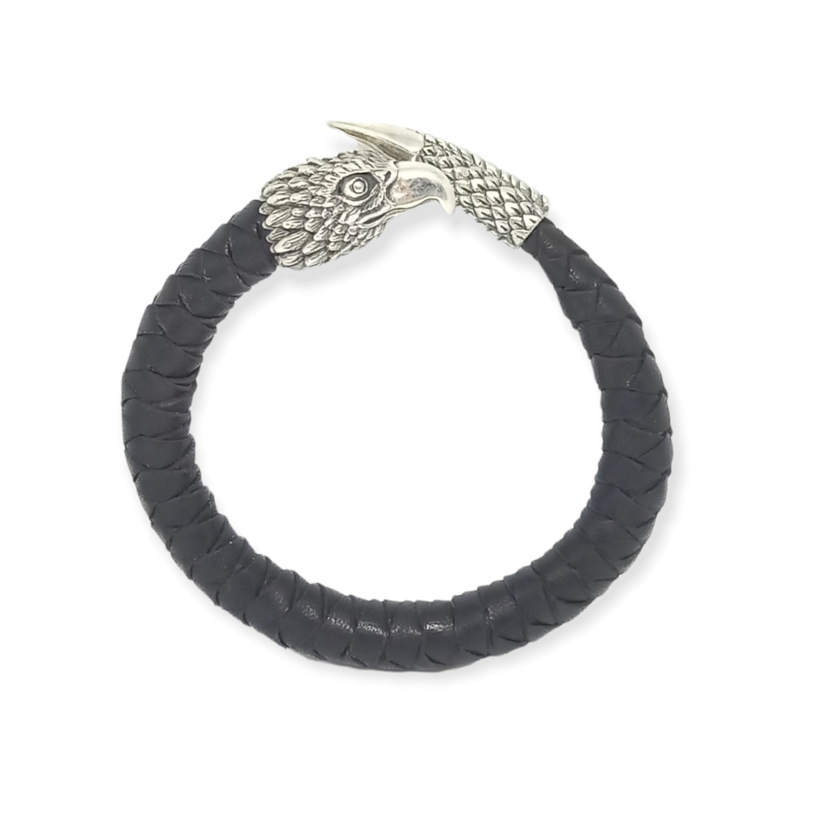 NY-CFB028Cuff bracelet with leather shaped like a snake. At the end attached the cast sterling silver bird’s head and tail.Diameter: 63 mm, Width: 10 mm leather, Est Weight: 30 grams.$30.99/ Piece